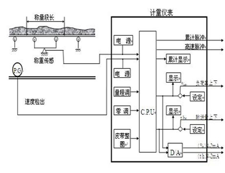 秤架由两个传感器悬挂着,当皮带上物料通过秤架上方时,物料重量过托辊压在传感器上,传感器输出信号和物料重量成正比。将它折算成单位皮带长度上的物料平均重量Gi(千克/米)。同时速度传感器测出当时的皮带运行速度Vi(米/秒),由此算出当时皮带上物料的瞬时流量(千克/秒)。将它累加起来,构成总的物料输送量M。其表达式如下:M=∑Gi×Vi但在实际称量中,皮带及秤架因有自重需要扣除,实际的运算公式应为:M=∑K×(Gi-Z)×Vi